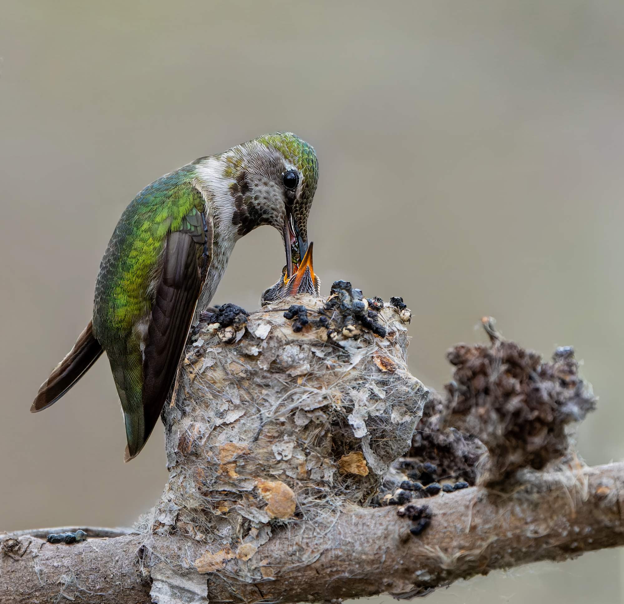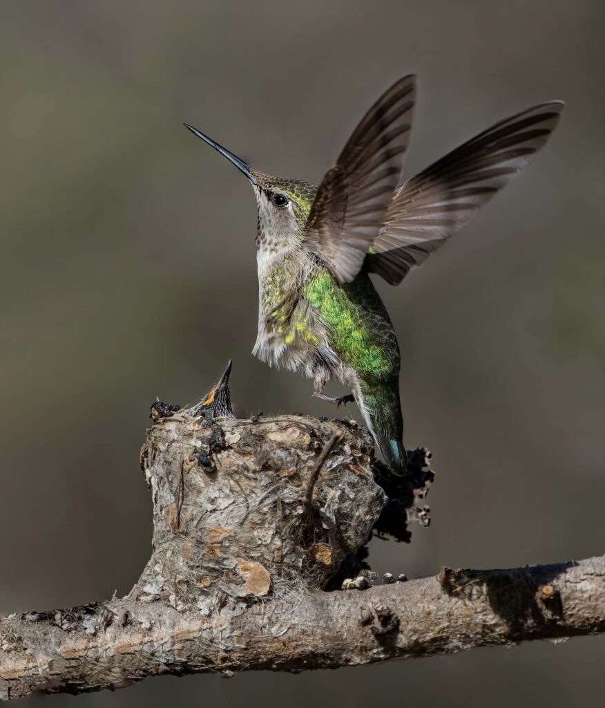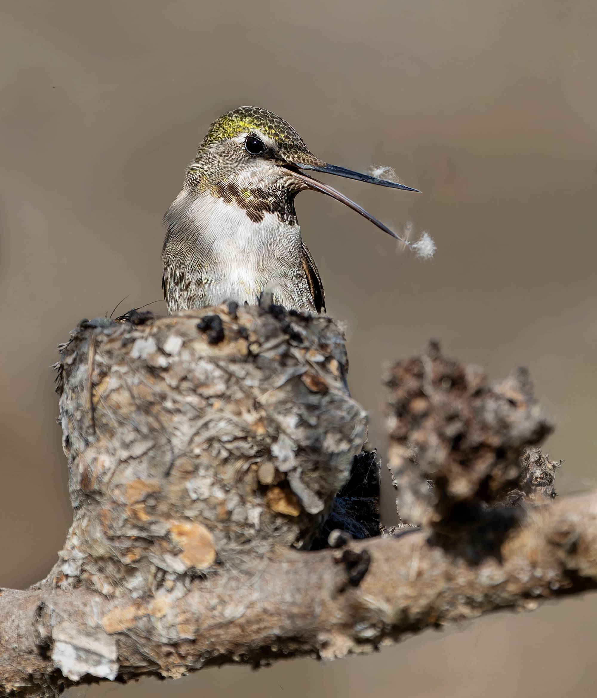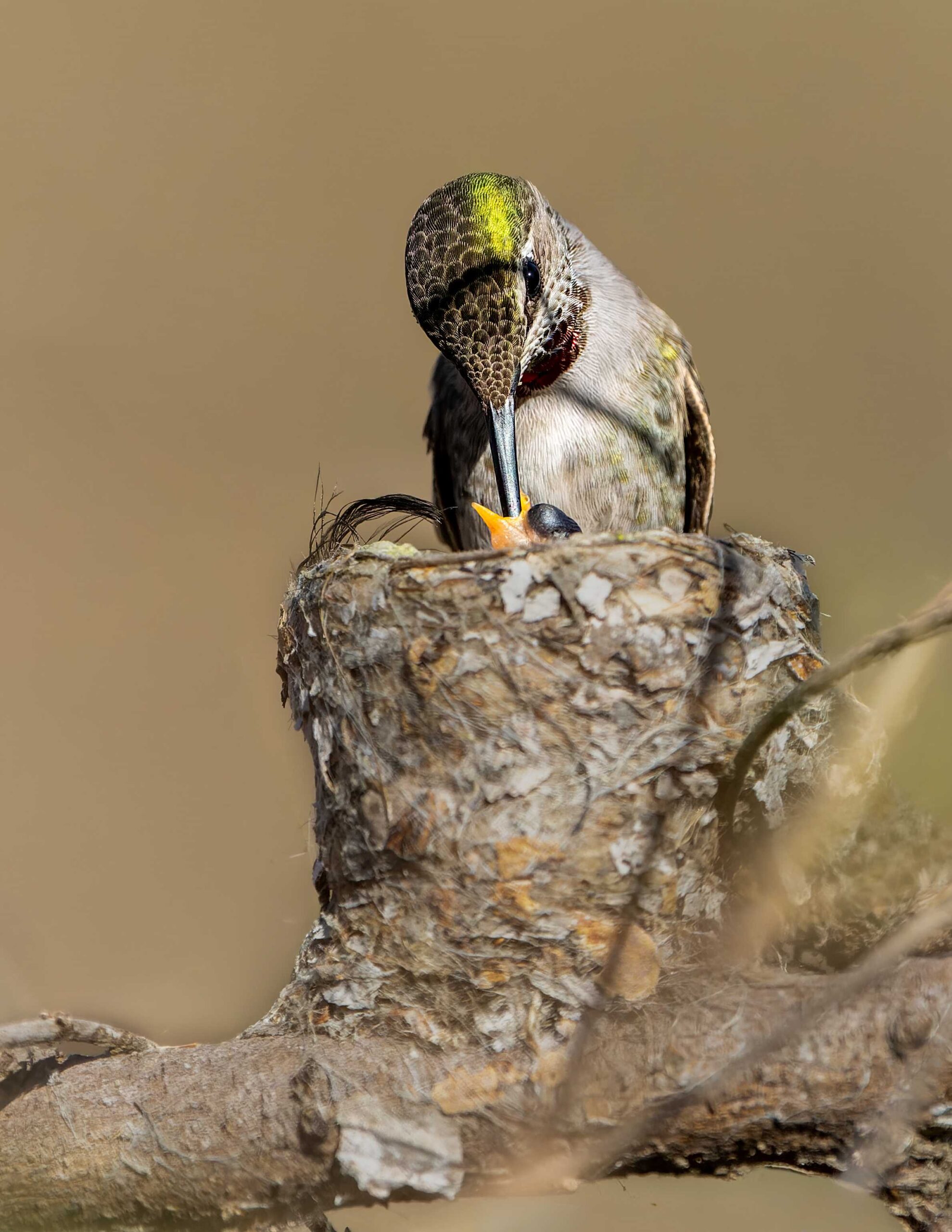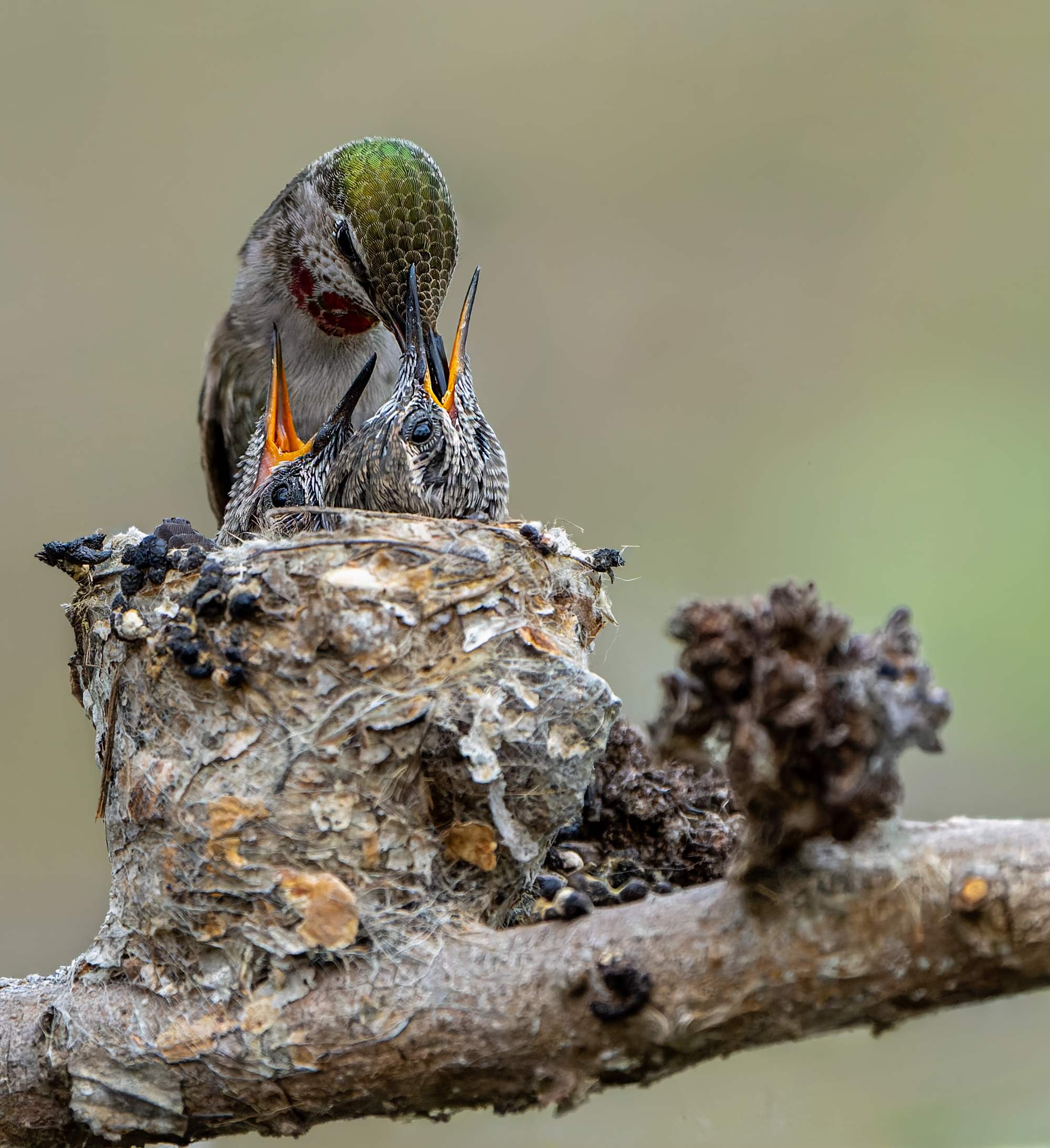 Female Anna’s hummingbirds raise their young alone, which starts by the female building a cup-shaped nest of spider silk, plant fragments, and lichen. The spider silk is an important component of the nest, as it gives the nest the flexibility to expand as the chicks grow larger.