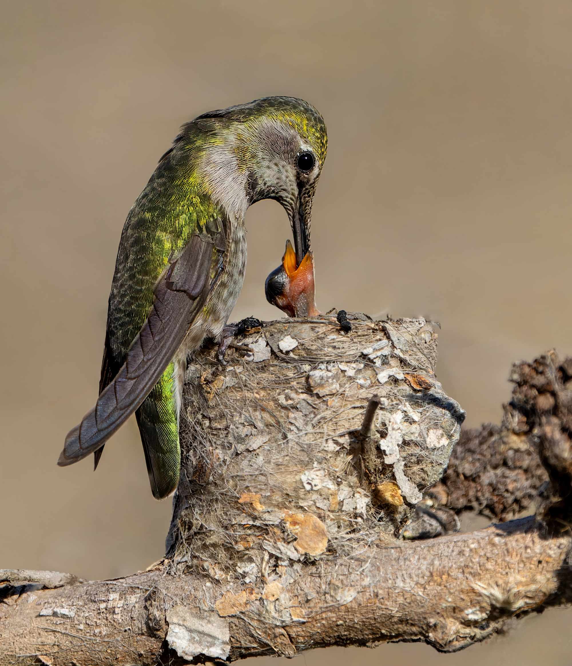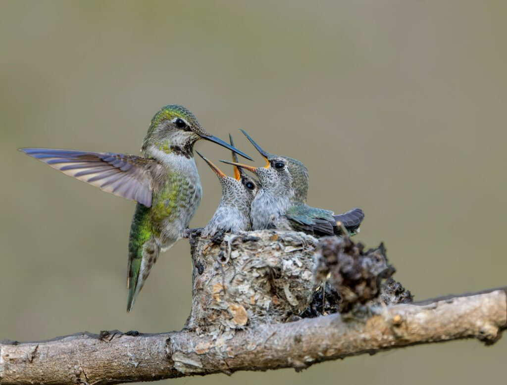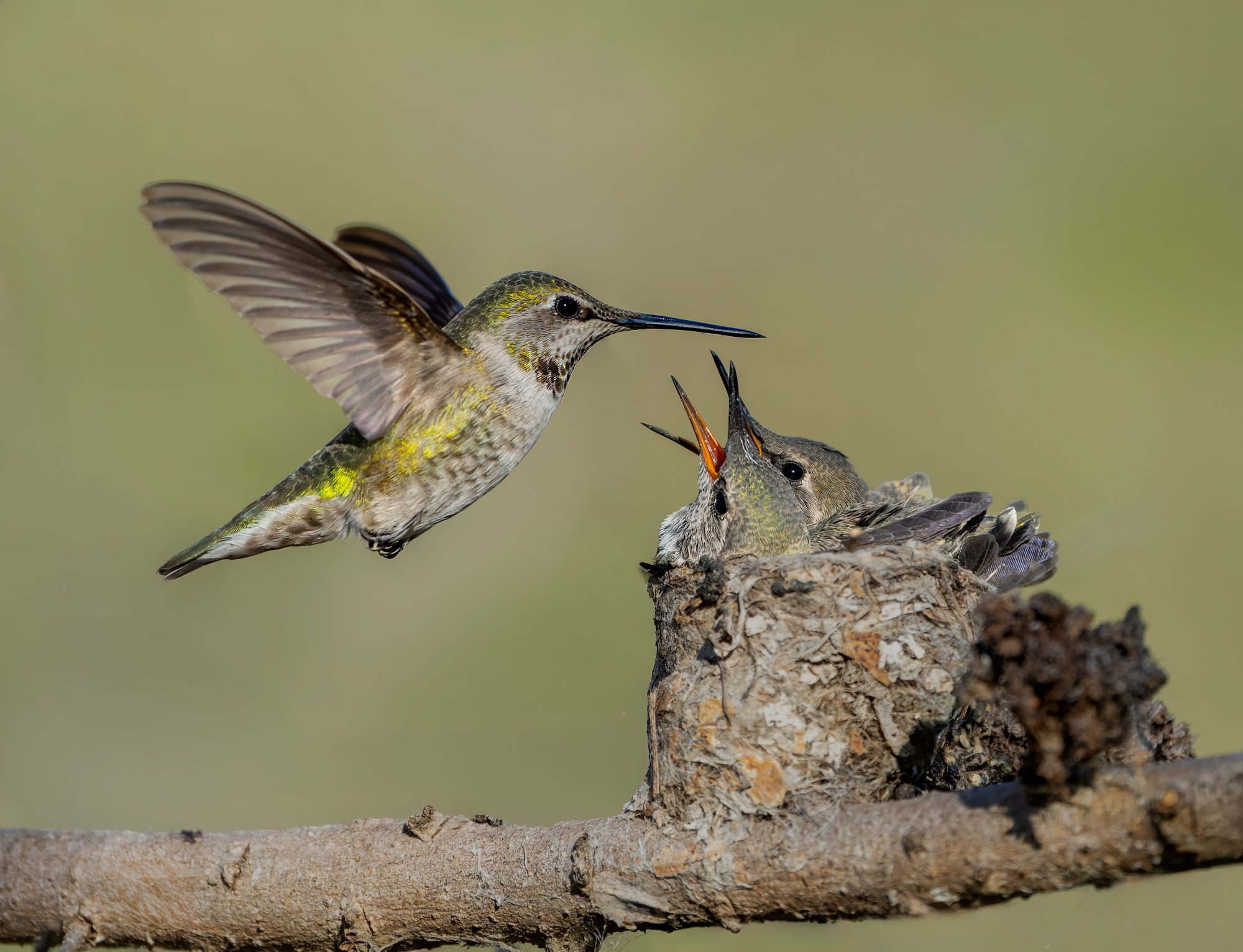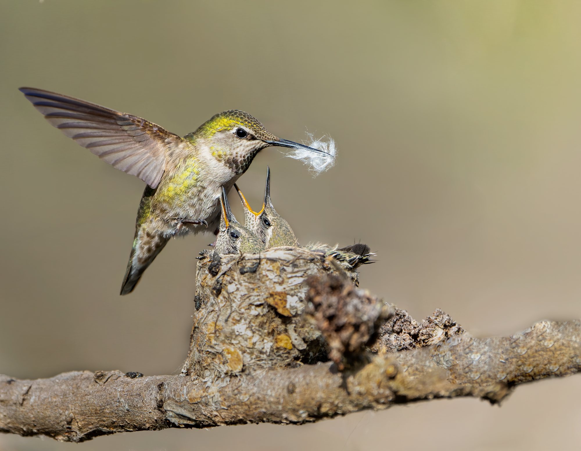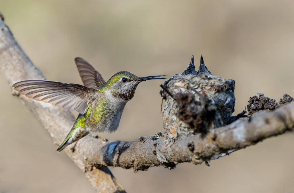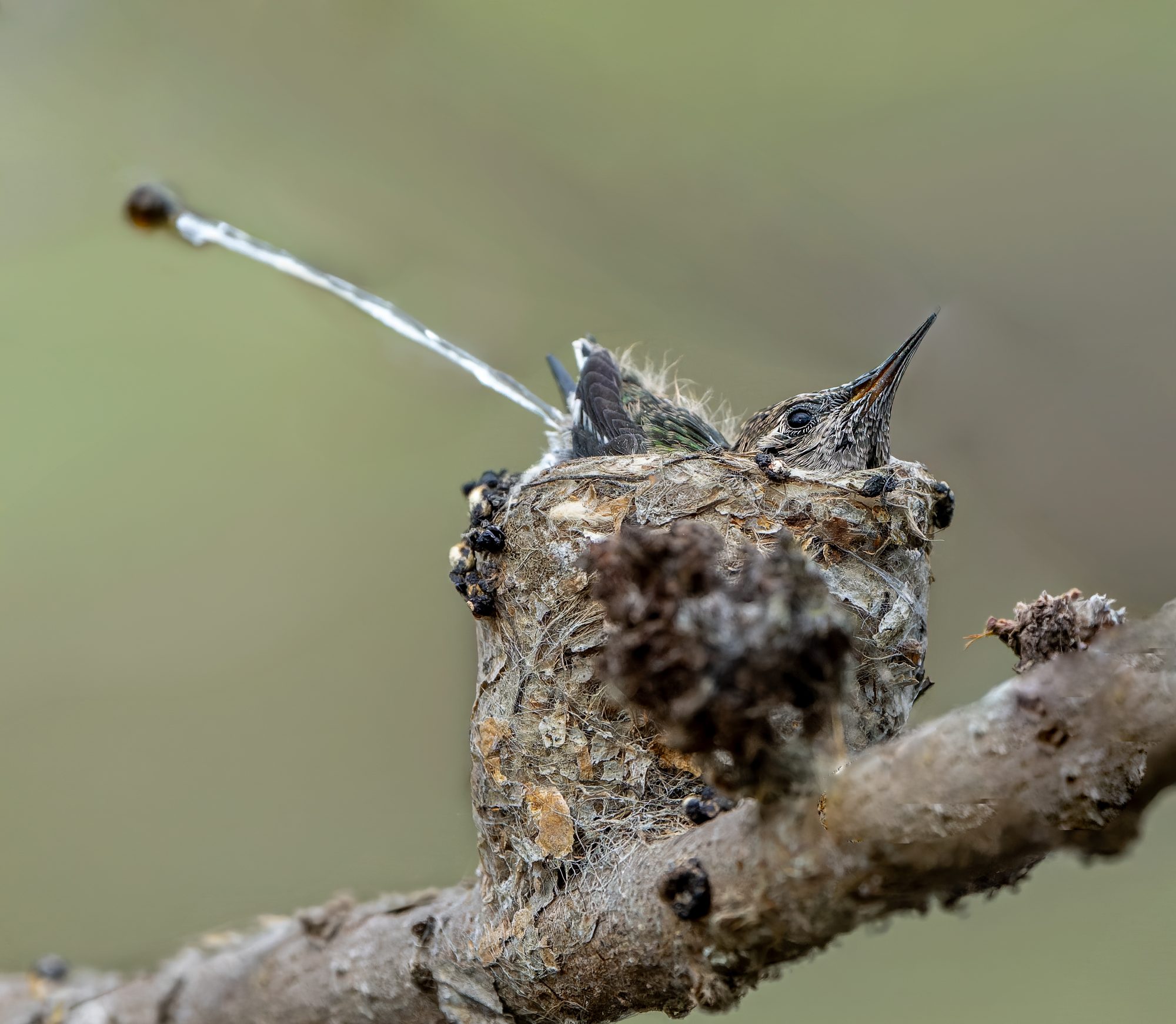 Female Anna’s hummingbirds raise their young alone, which starts by the female building a cup-shaped nest of spider silk, plant fragments, and lichen. The spider silk is an important component of the nest, as it gives the nest the flexibility to expand as the chicks grow larger.