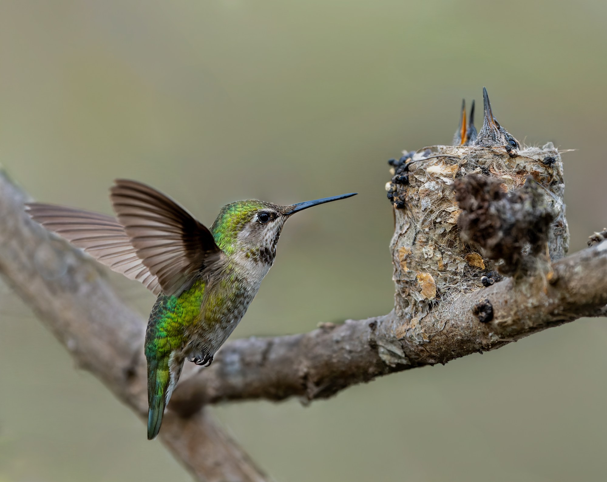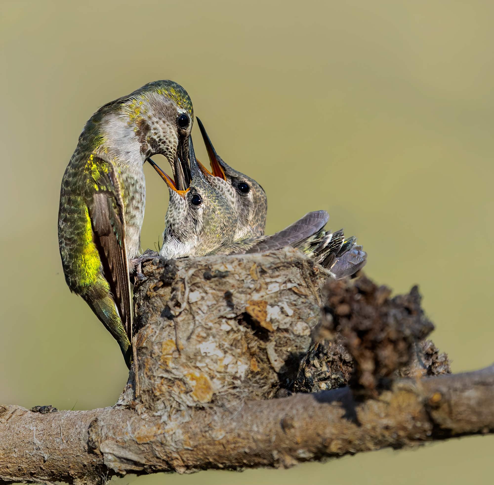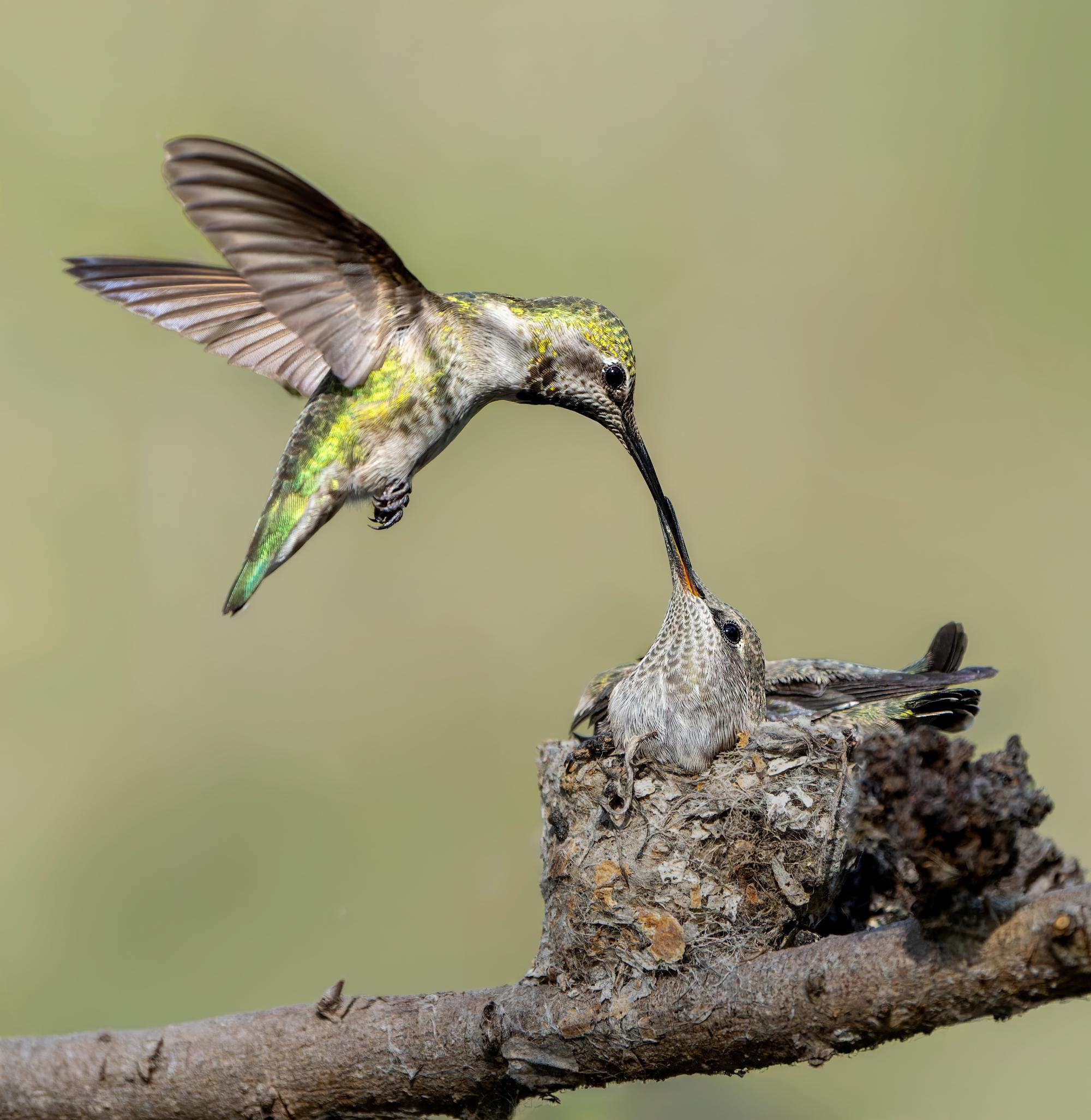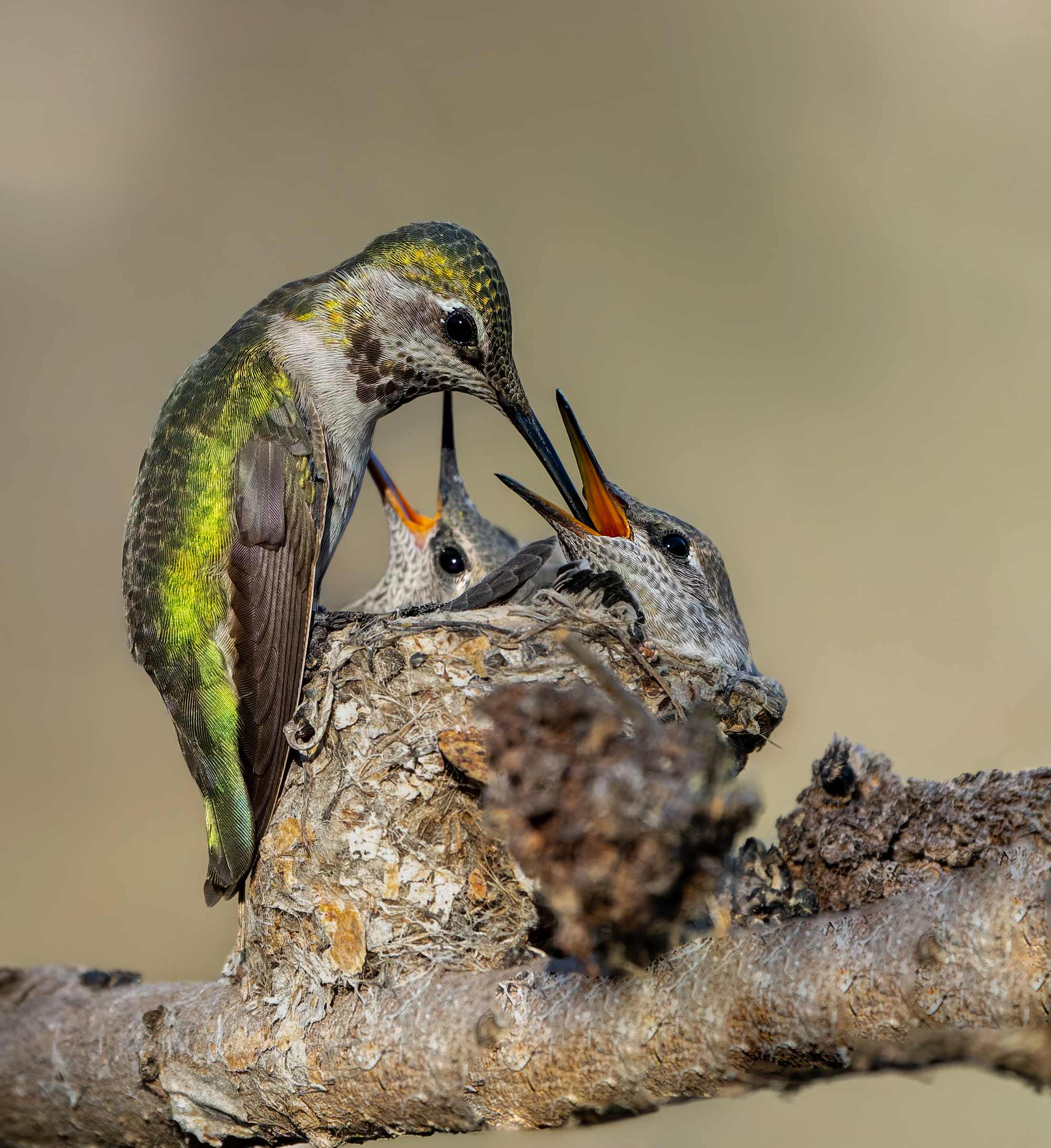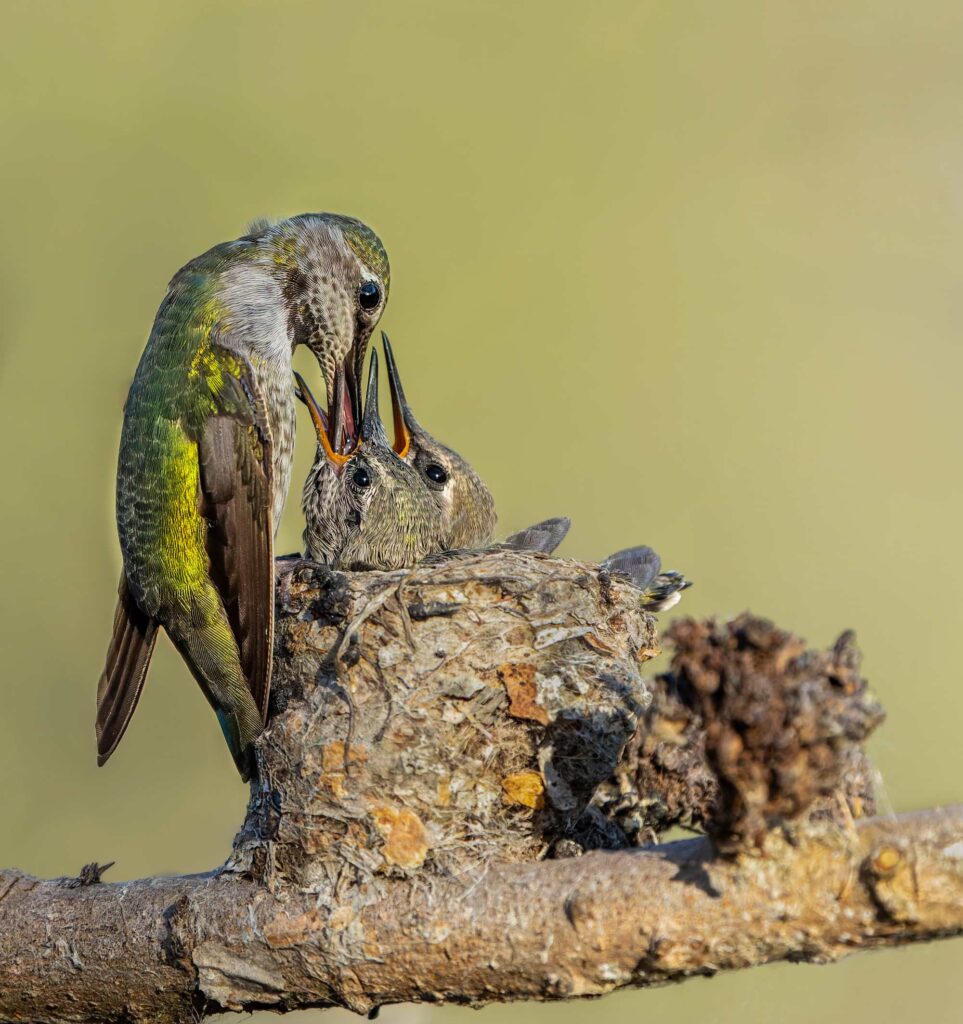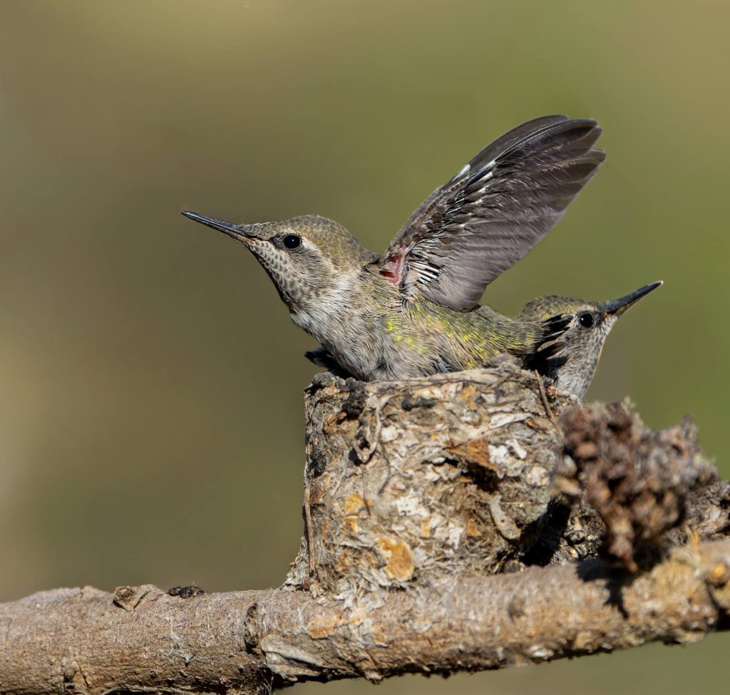 Female Anna’s hummingbirds raise their young alone, which starts by the female building a cup-shaped nest of spider silk, plant fragments, and lichen. The spider silk is an important component of the nest, as it gives the nest the flexibility to expand as the chicks grow larger.