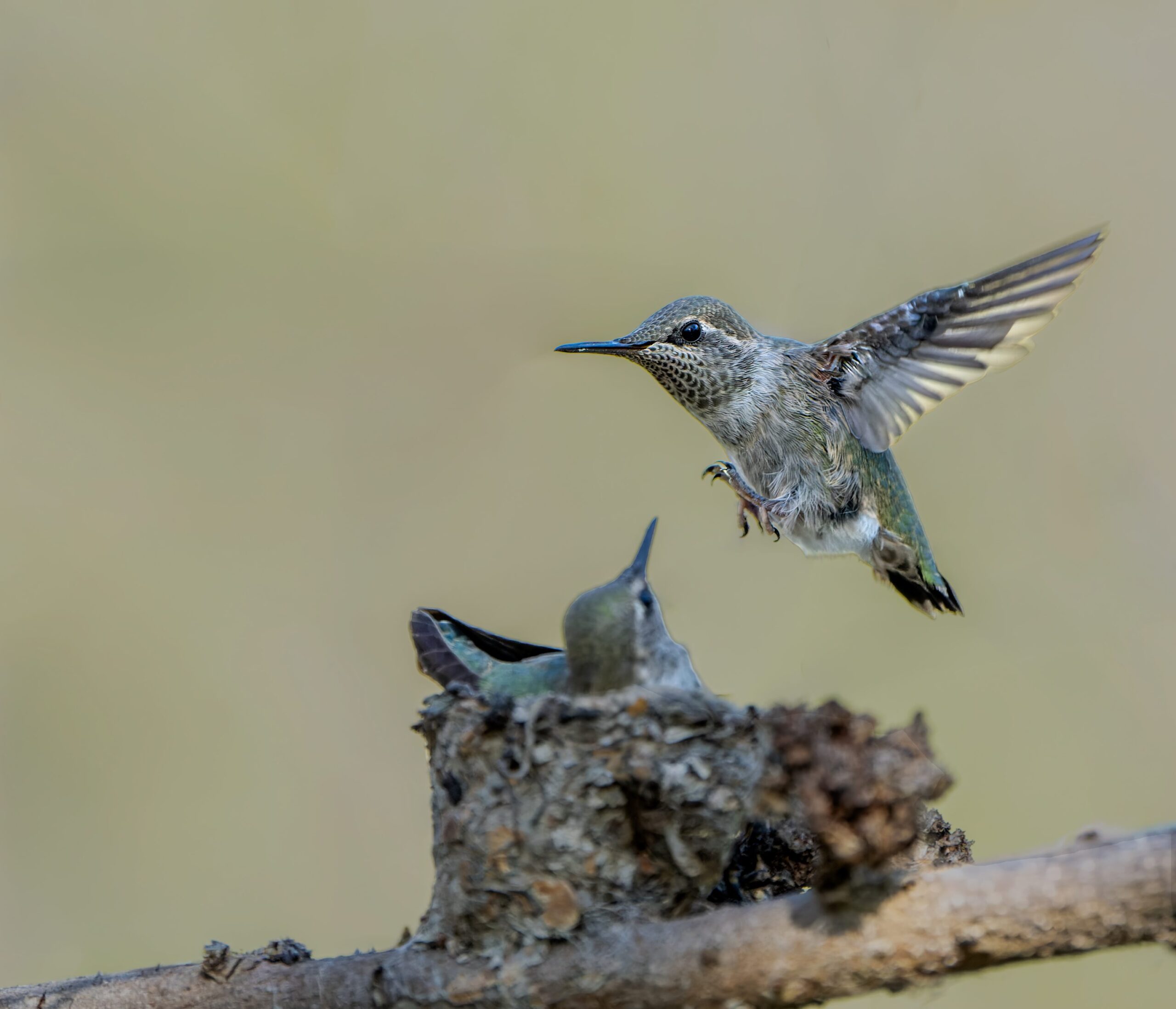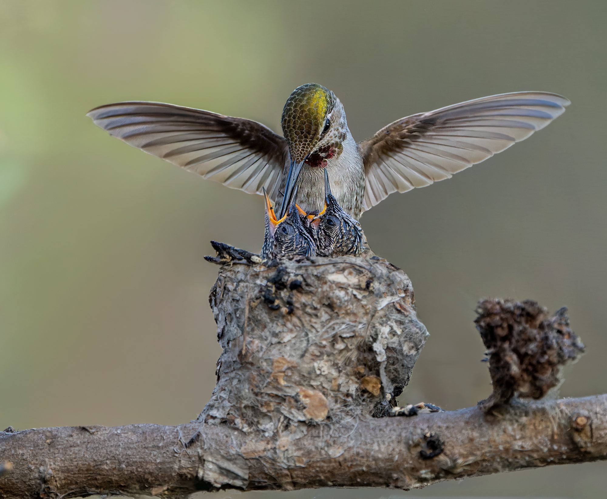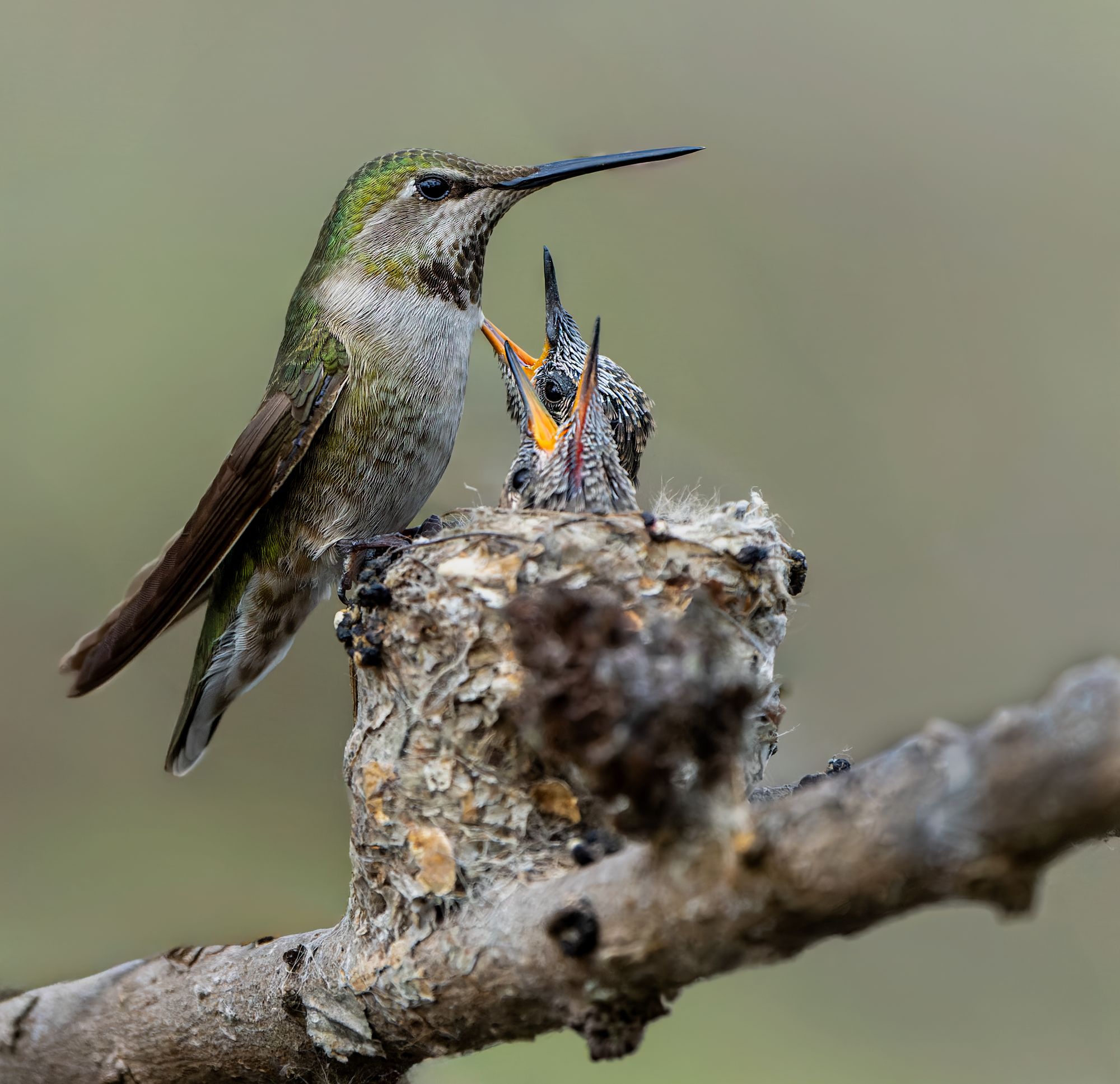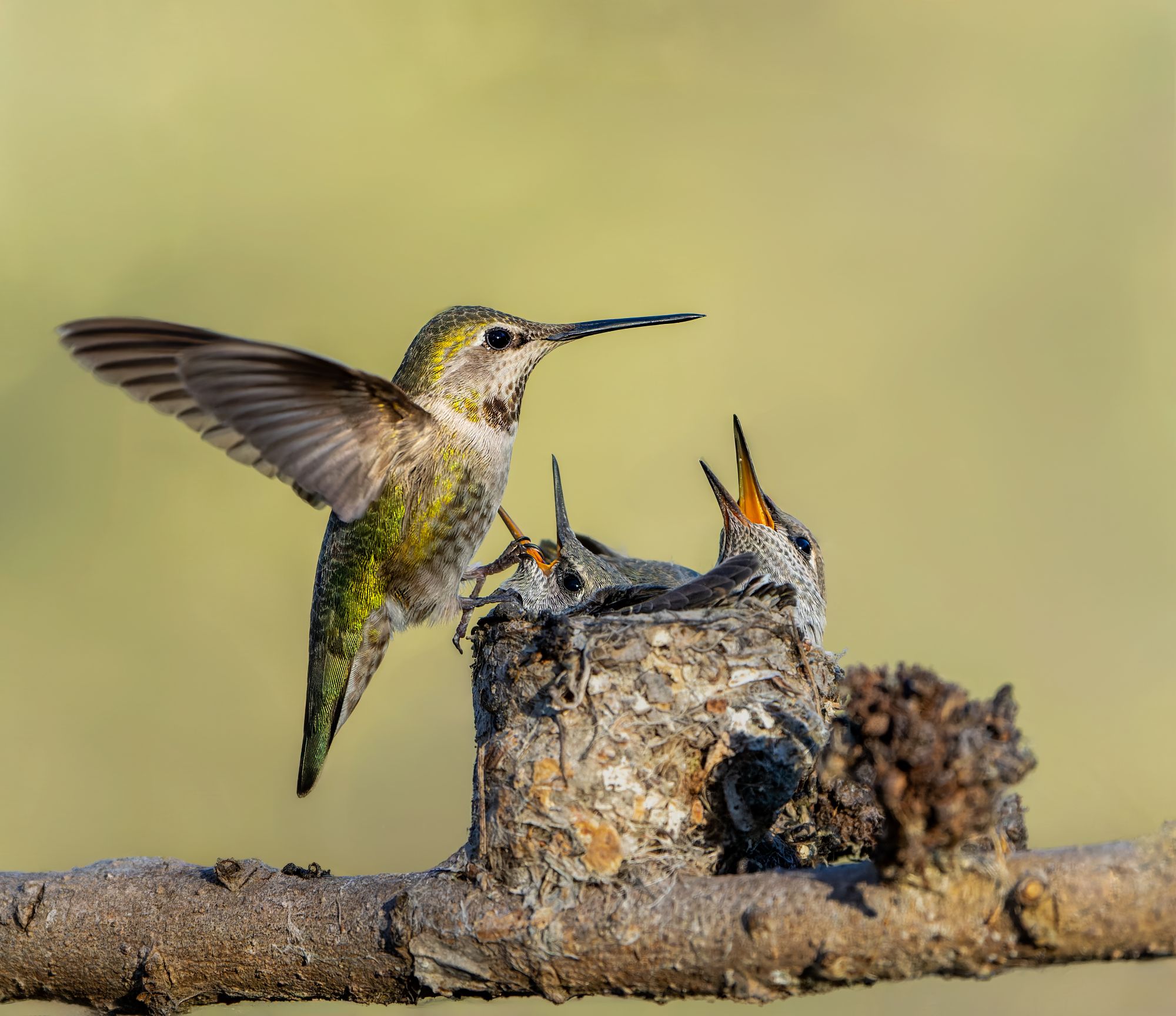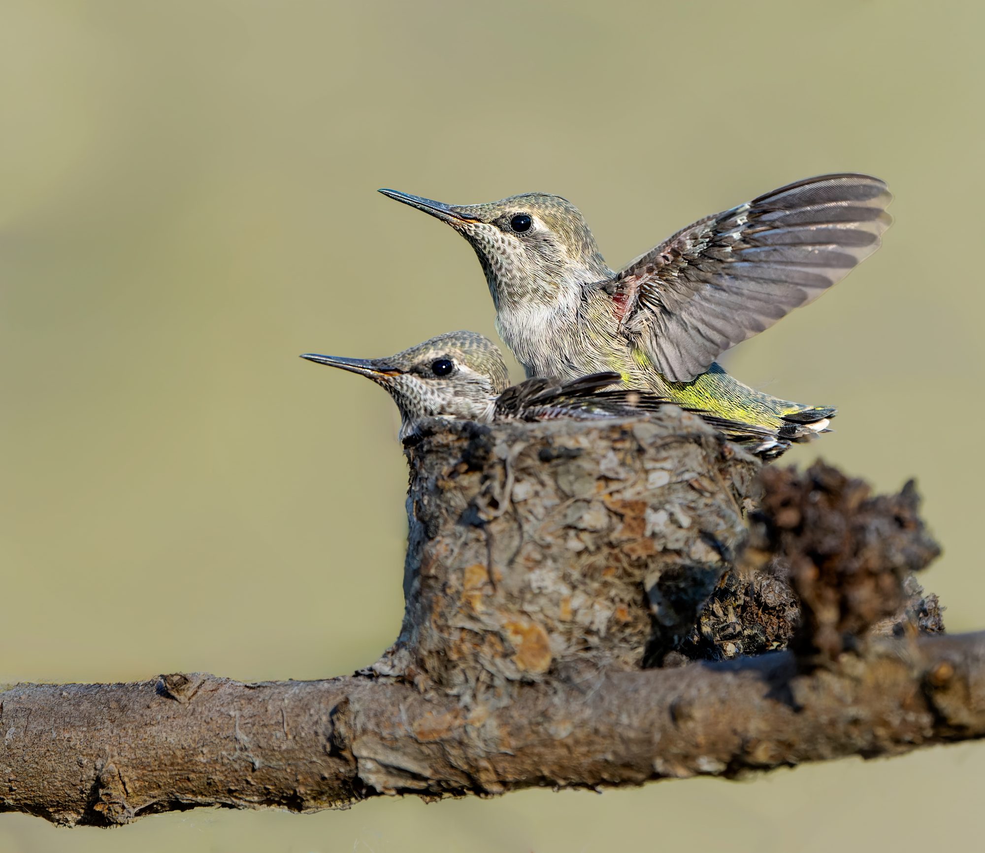 Female Anna’s hummingbirds raise their young alone, which starts by the female building a cup-shaped nest of spider silk, plant fragments, and lichen. The spider silk is an important component of the nest, as it gives the nest the flexibility to expand as the chicks grow larger.