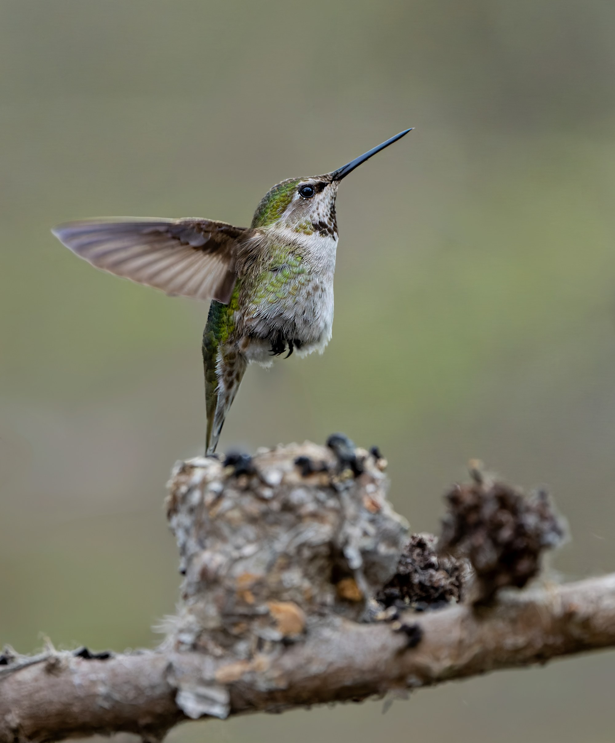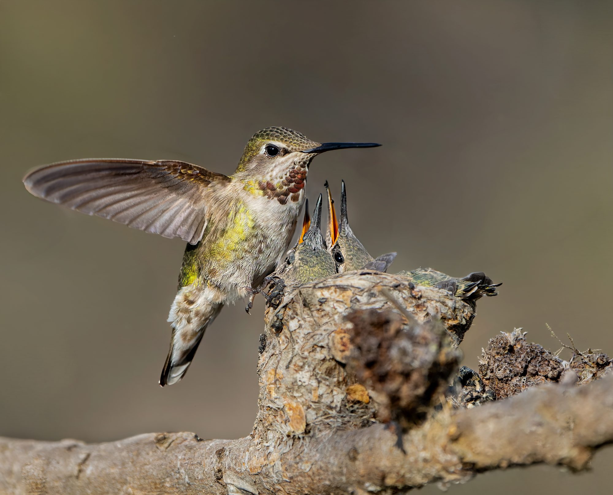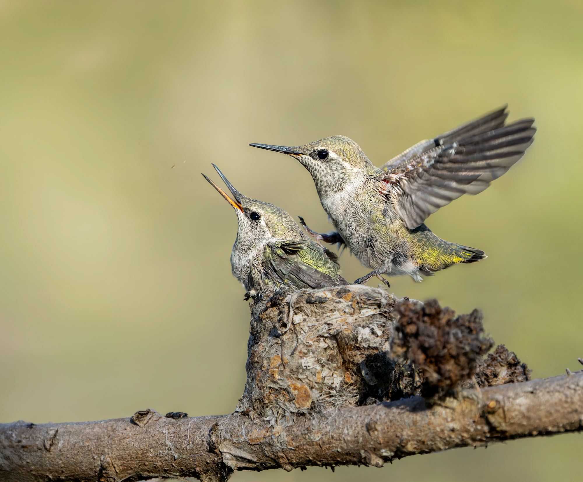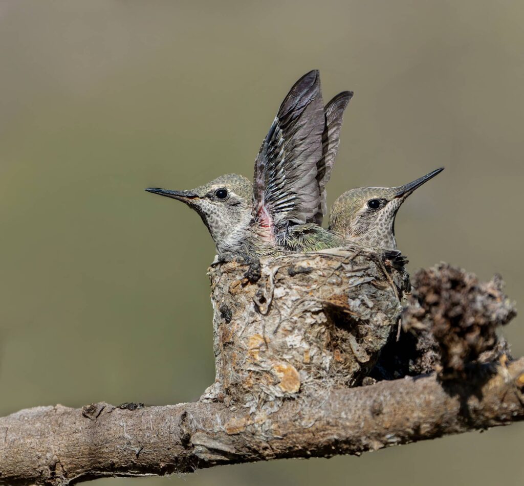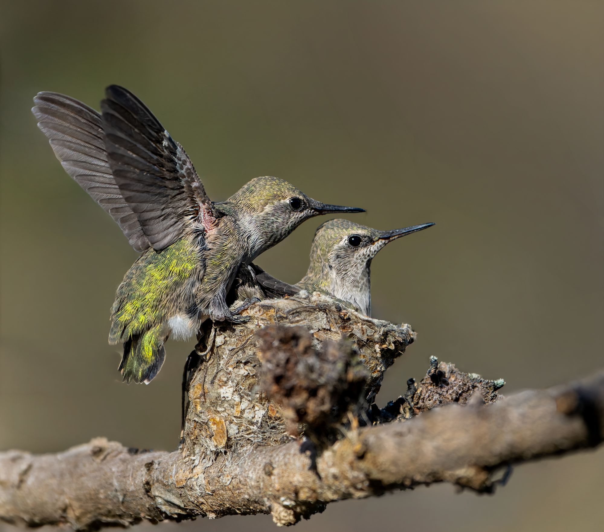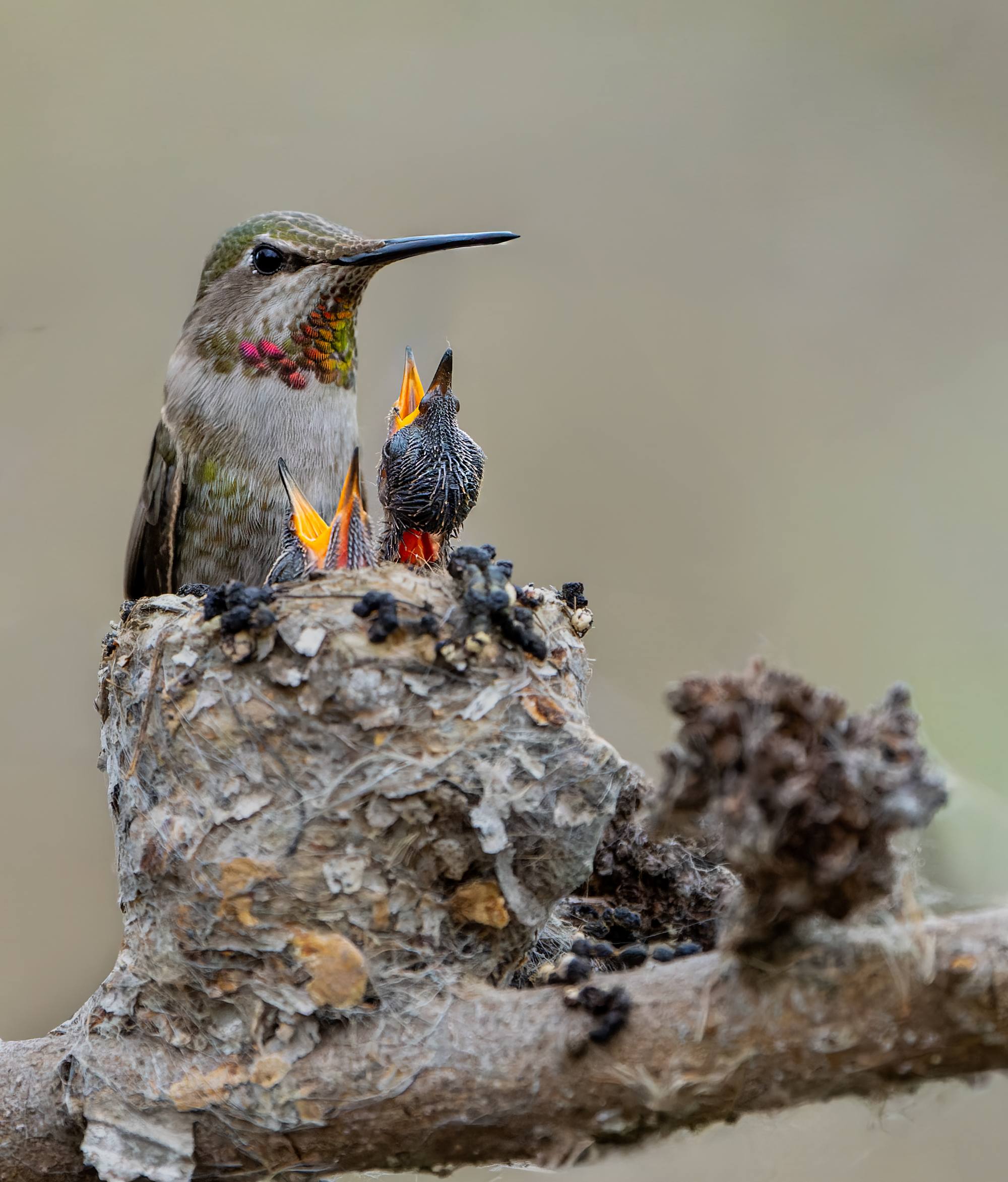 Female Anna’s hummingbirds raise their young alone, which starts by the female building a cup-shaped nest of spider silk, plant fragments, and lichen. The spider silk is an important component of the nest, as it gives the nest the flexibility to expand as the chicks grow larger.