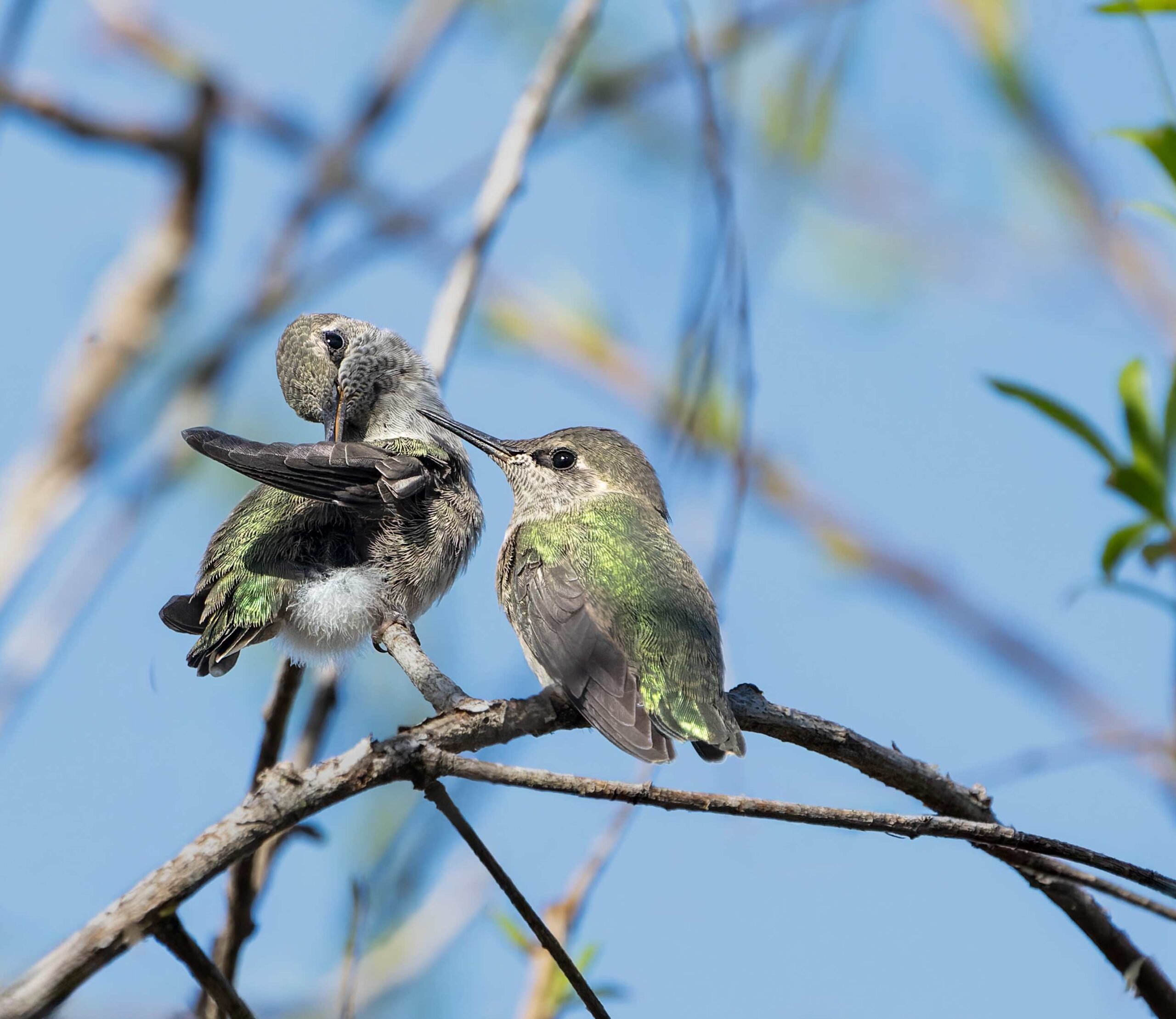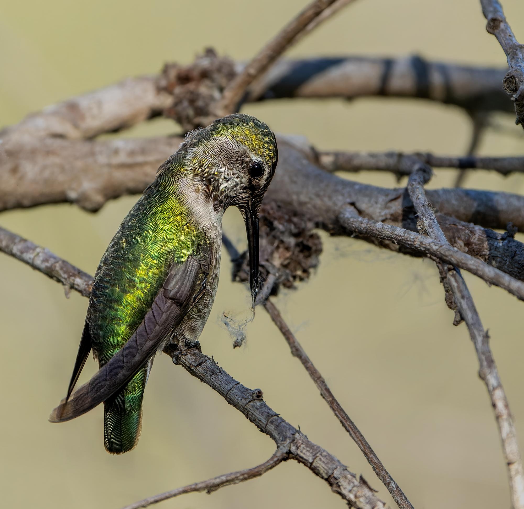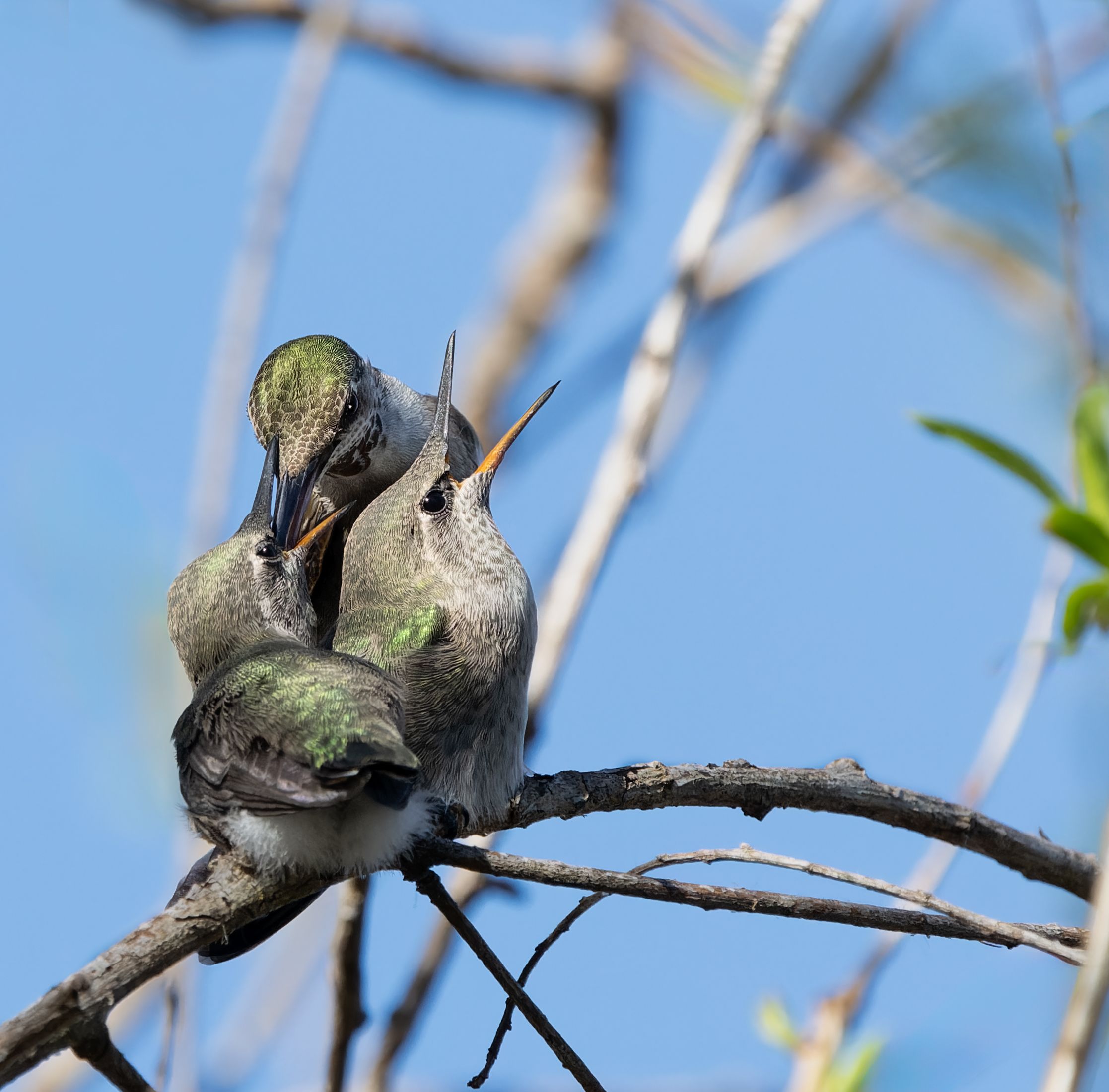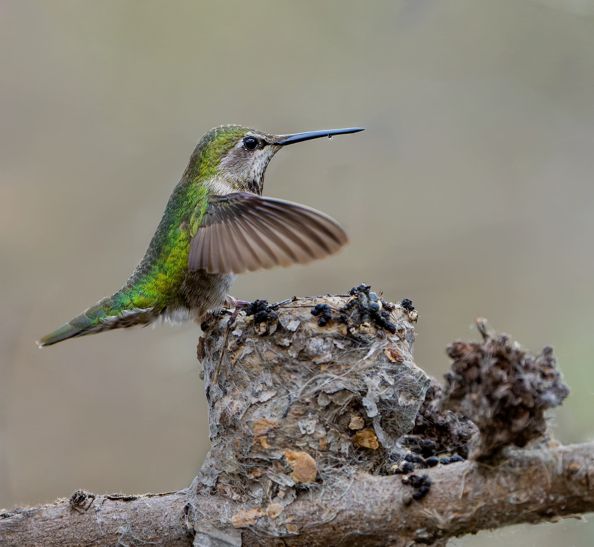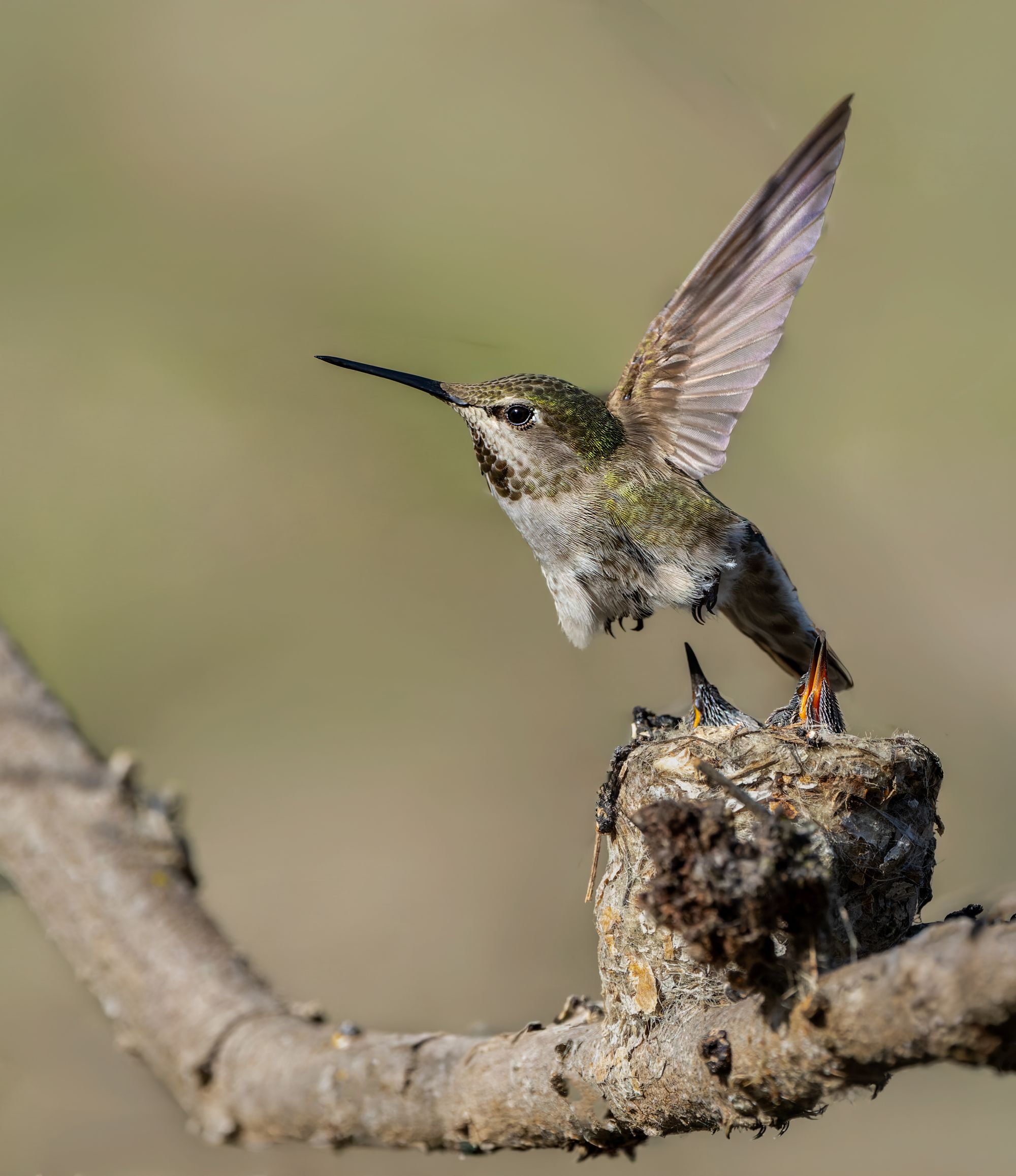 Female Anna’s hummingbirds raise their young alone, which starts by the female building a cup-shaped nest of spider silk, plant fragments, and lichen. The spider silk is an important component of the nest, as it gives the nest the flexibility to expand as the chicks grow larger.