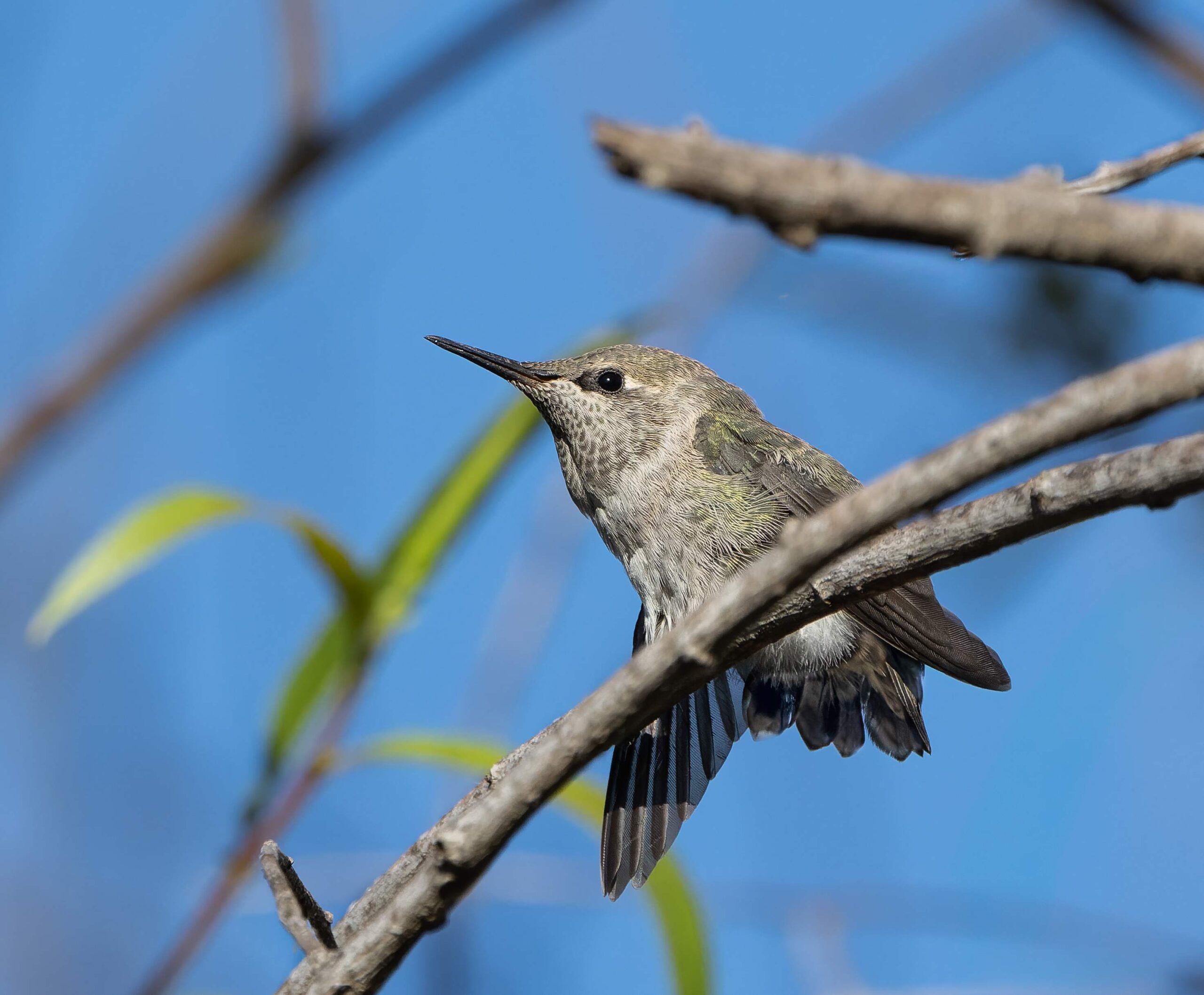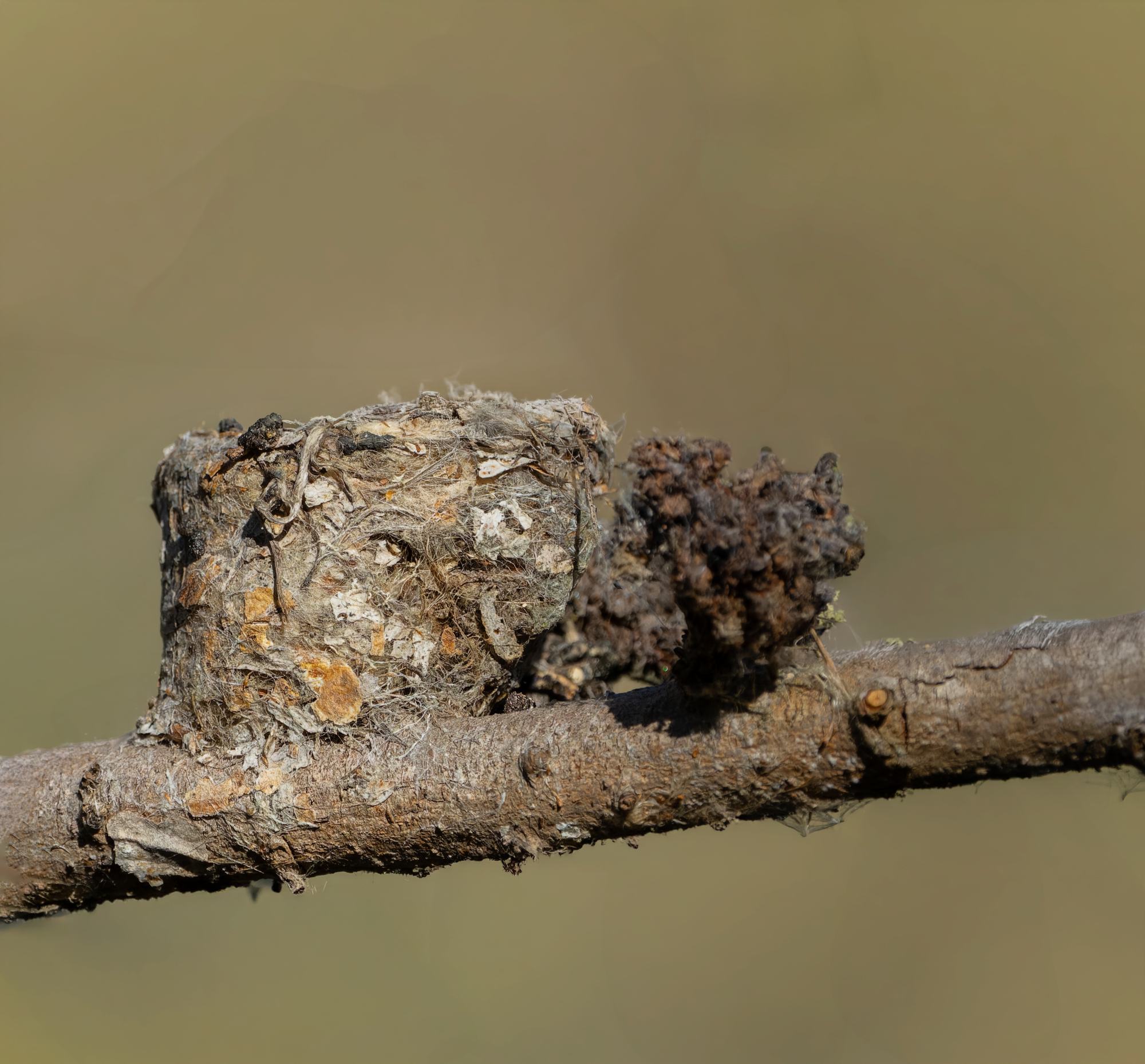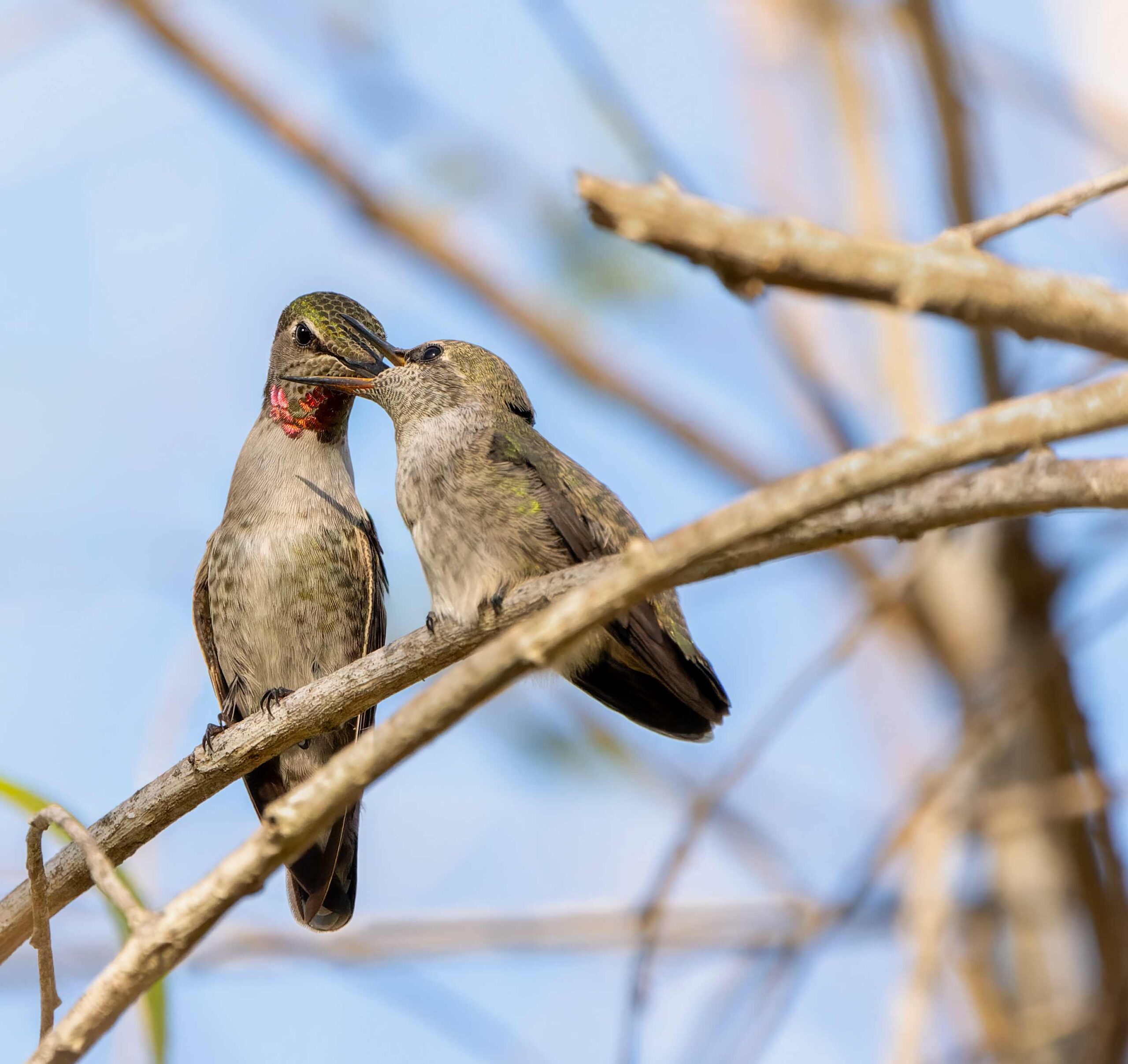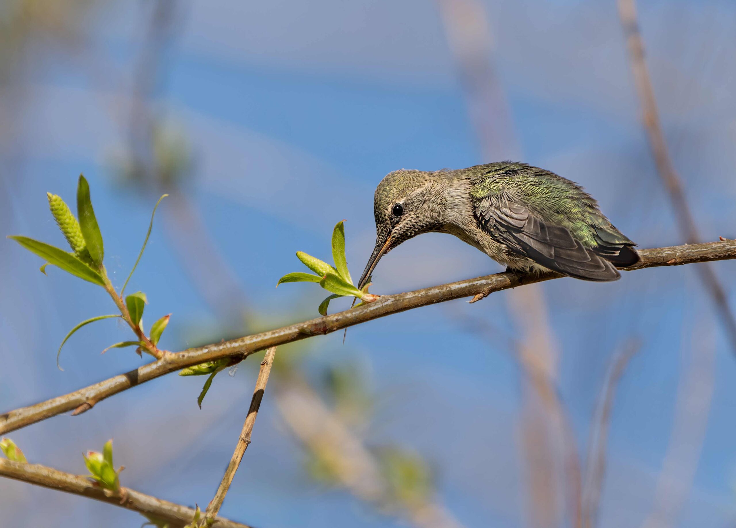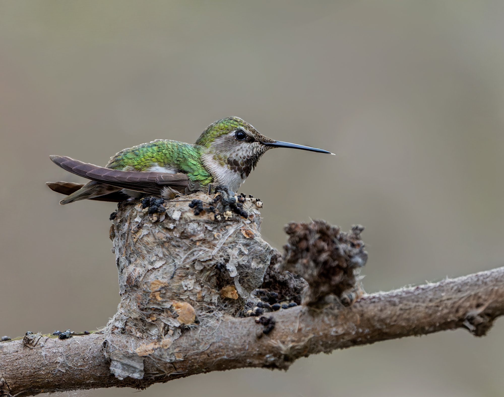Female Anna’s hummingbirds raise their young alone, which starts by the female building a cup-shaped nest of spider silk, plant fragments, and lichen. The spider silk is an important component of the nest, as it gives the nest the flexibility to expand as the chicks grow larger.