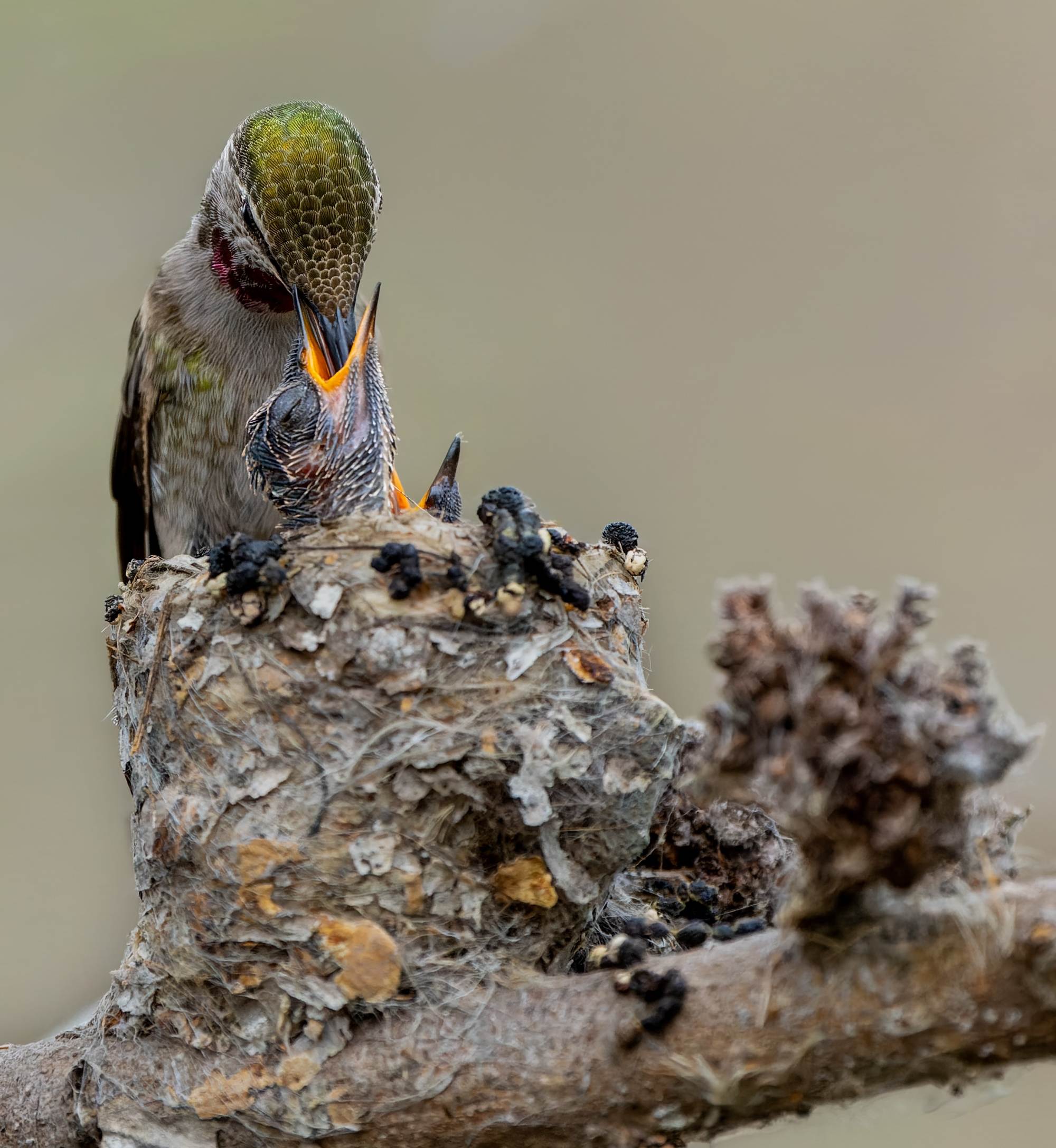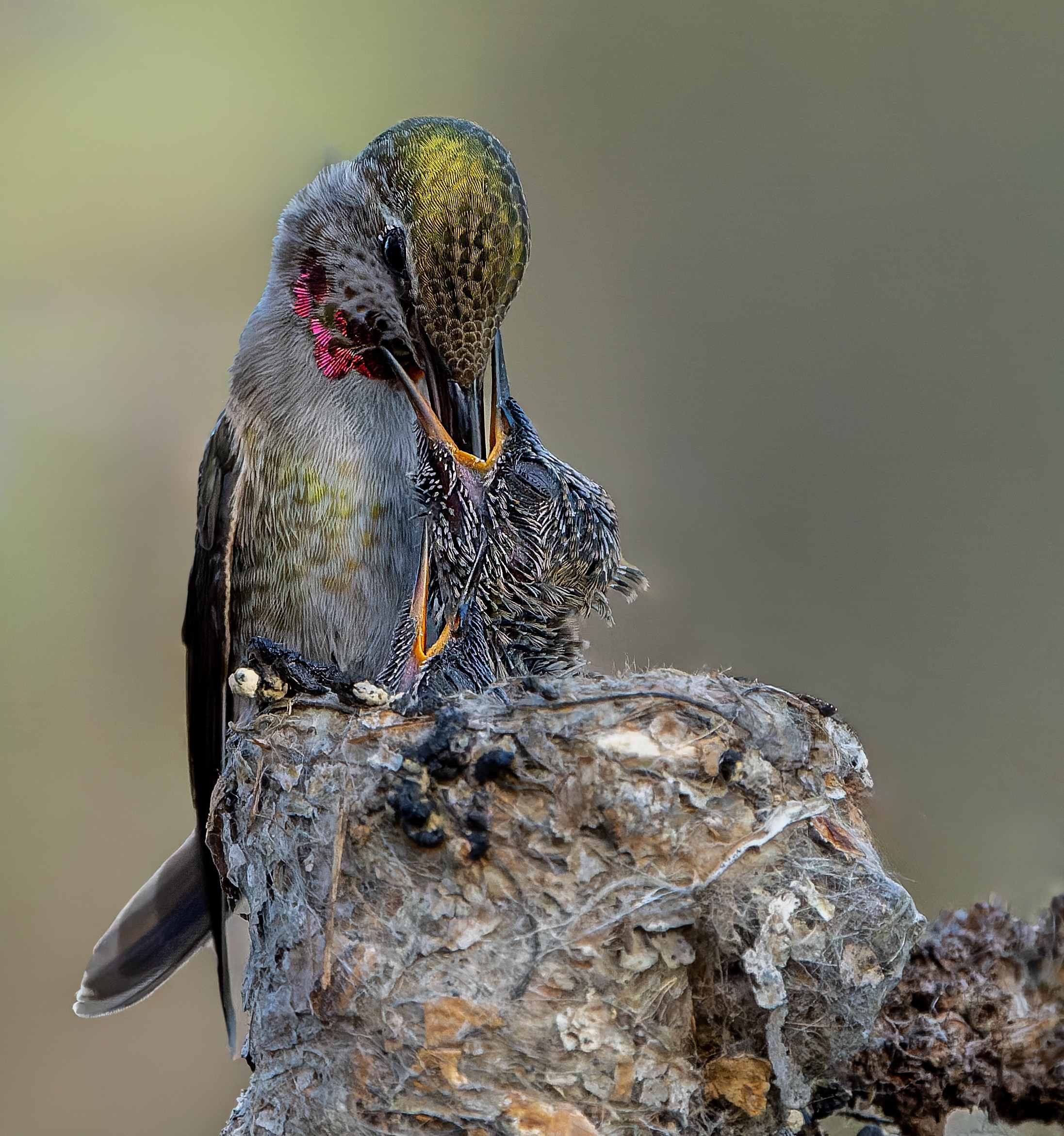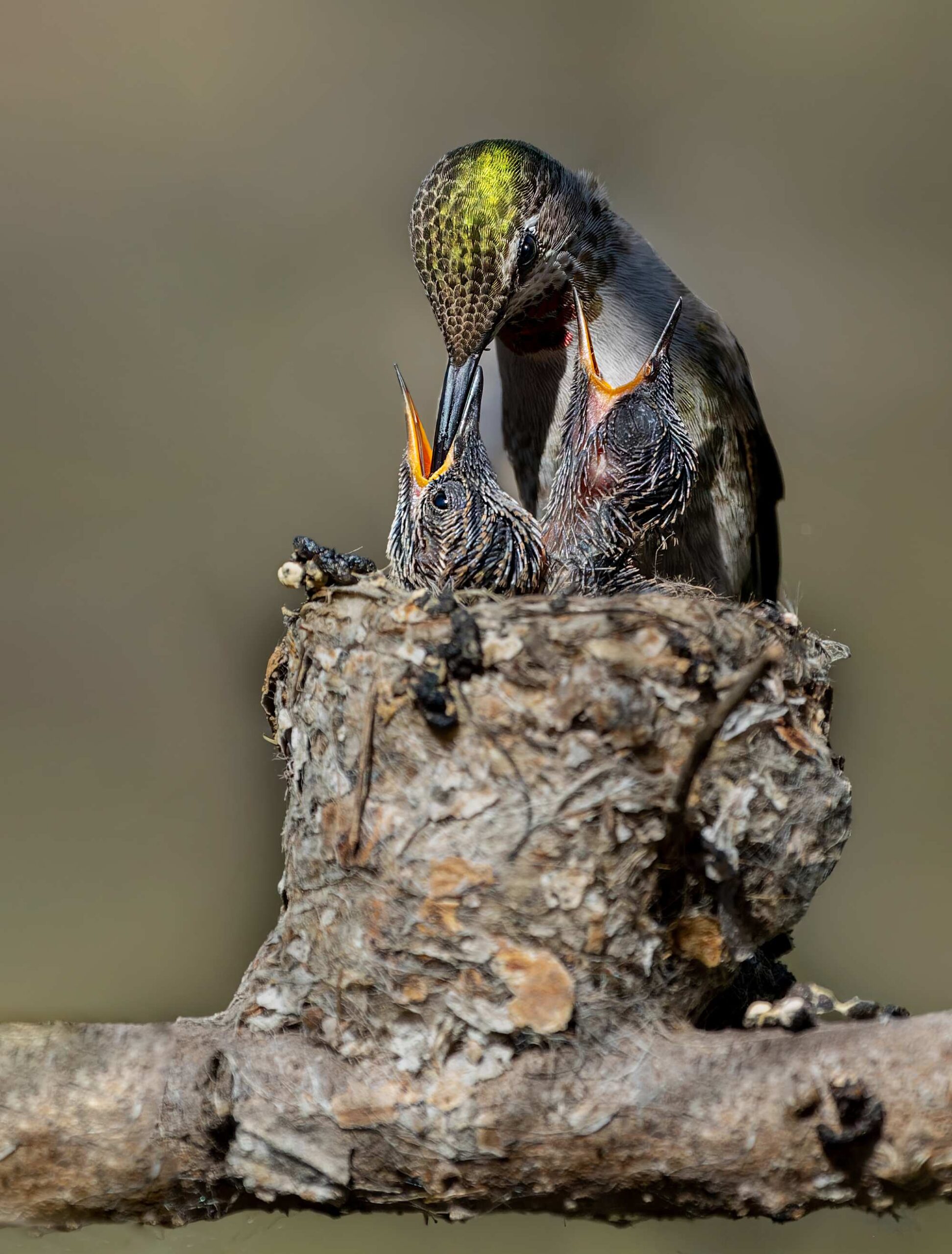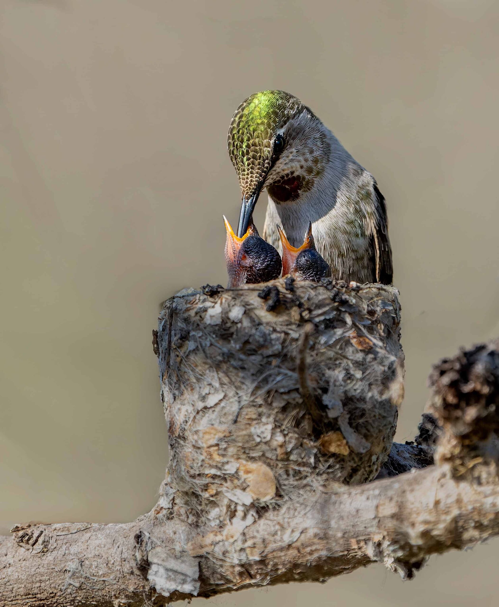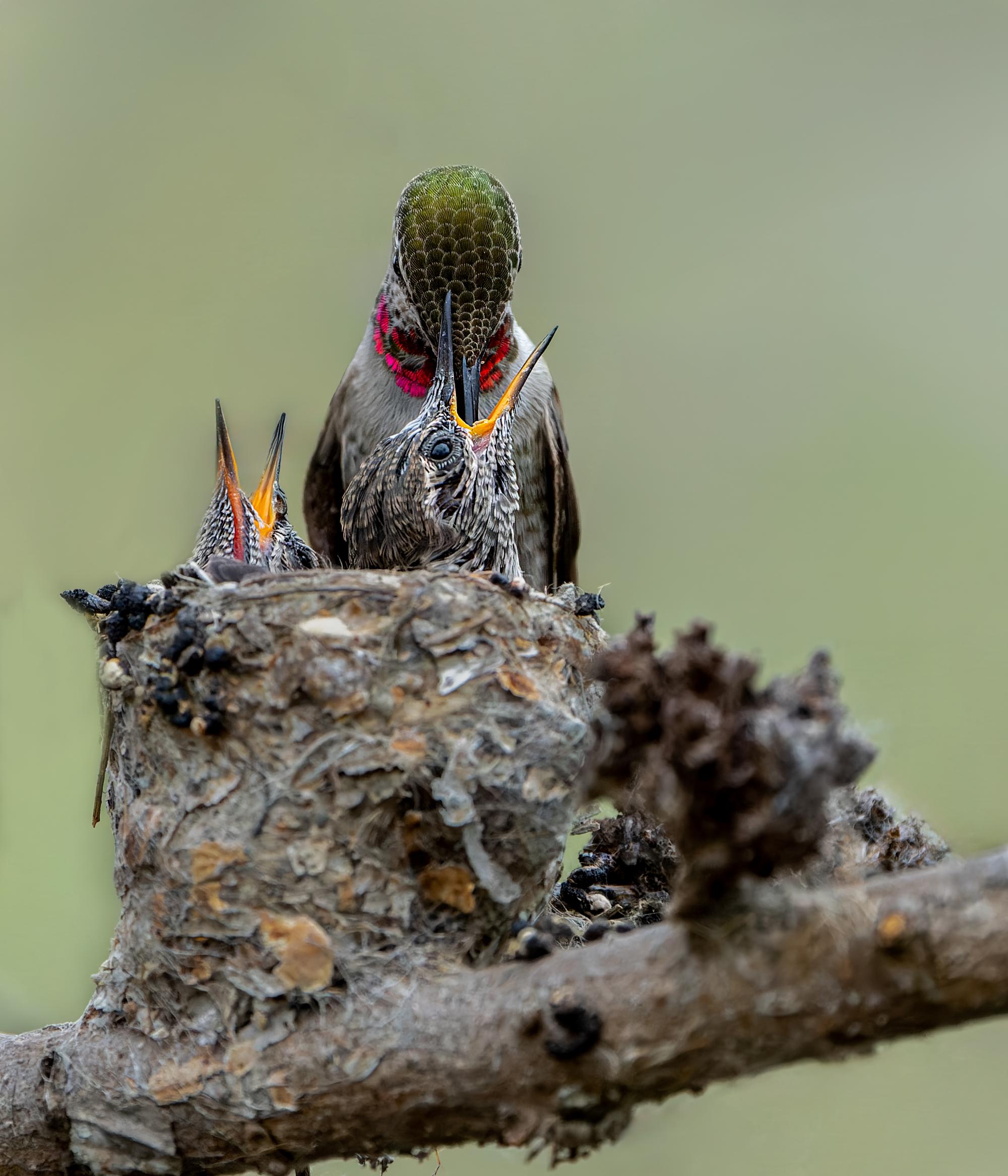 Mom arrives at the nest with a drop of nectar on her beak. The chicks pop up immediately and she begins to feed them. In the second shot, with her beak partially open, you can see the slurry of nectar and bugs the mother is depositing down the chick’s throat.