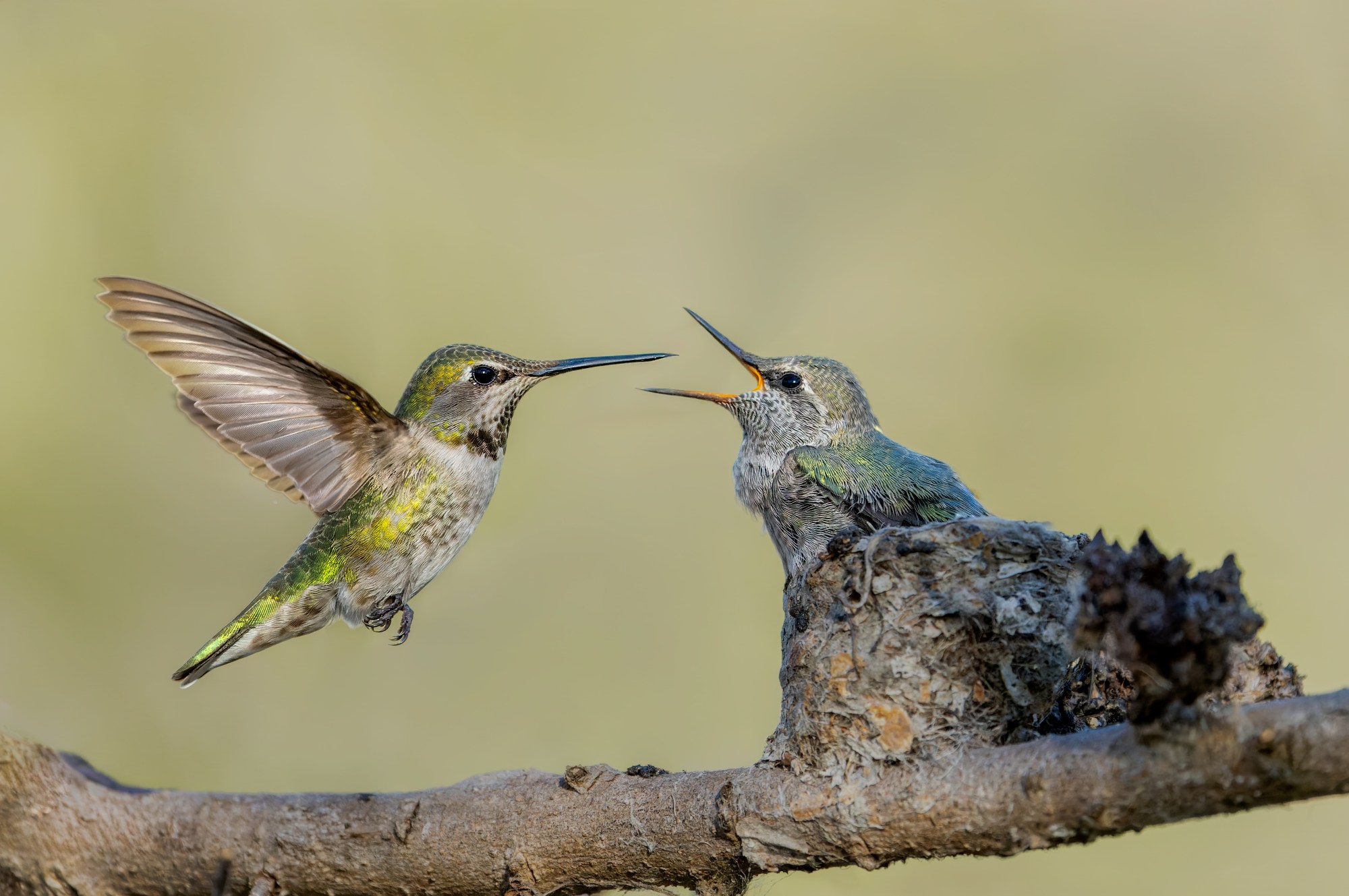 When the nest is complete, the mother lays two tiny eggs, each about the size of a jelly bean, and incubates them for 14–19 days. Once the chicks are born, the mother feeds them a slurry of regurgitated insects and nectar for 18–28 days until they fledge, which is the term used for leaving the nest to live independently.