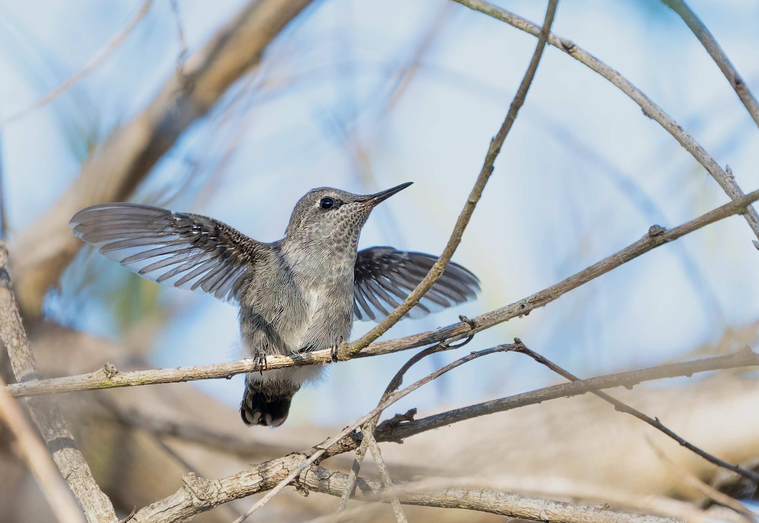 As soon as the mother left, my eye picked up movement about 10 feet below the chick that had just been fed. However, that movement was in a clump of dense sticks in the tree, so I couldn’t make out what it was. Just seconds later, something lifted up and flew to another part of the tree, this time giving me a clearer view. There was the second chick, also fledged and out of the nest! In the second photo here, you can see it with its wings spread, still partially translucent with the feathers not fully filled in.